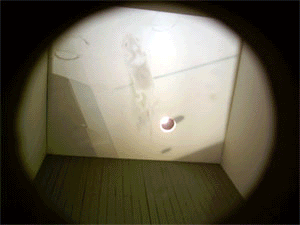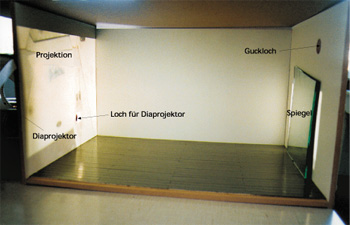 Projektionsraum von der Seite gesehen (diese Seite ist ansonsten durch die Rückwand des Hauptraumes geschlossen) |