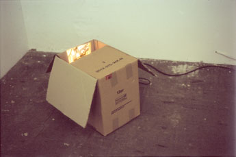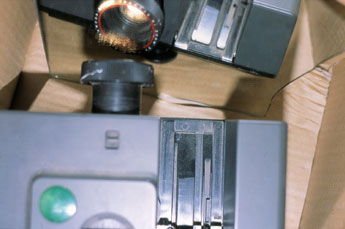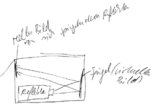 In der Kiste verborgen steht der Diaprojektor Reflekta vor einem Spiegel. Über den Spiegel wird das Bild, das er erzeugt, an die gegenüberliegende Wand projiziert. Das Dia zeigt Reflekta vor dem Spiegel stehend in der Kiste. |
